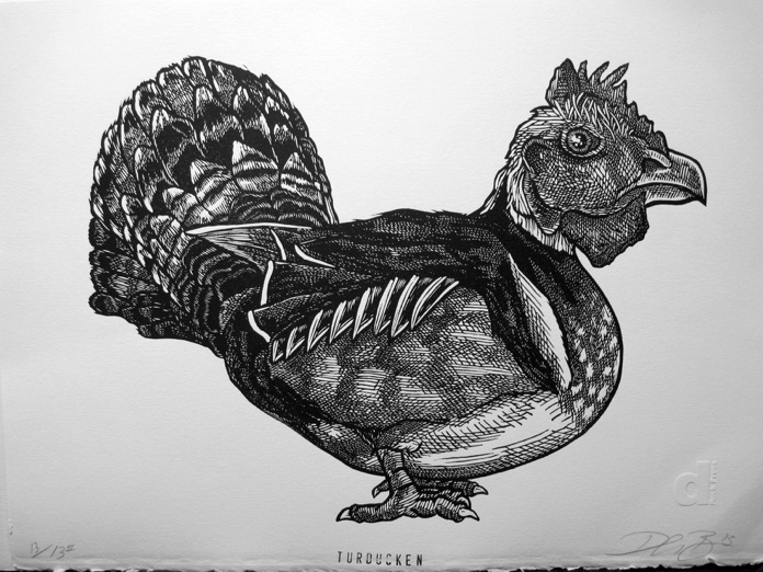 The Turducken has found its way into the holiday tradition and is becoming as much of a staple of the season as eggnog or fruit cake. The turducken is presented as a mythological/genetically altered free range hybrid of all those edible birds (Turkey/Duck/Chicken) wrapped up into one. Although I’ve never eaten a turducken, it is my understanding that they are simultaneously delicious while throwing the consumer into a fit of depression for consuming such a grisly scene of bird stuffed carnage.